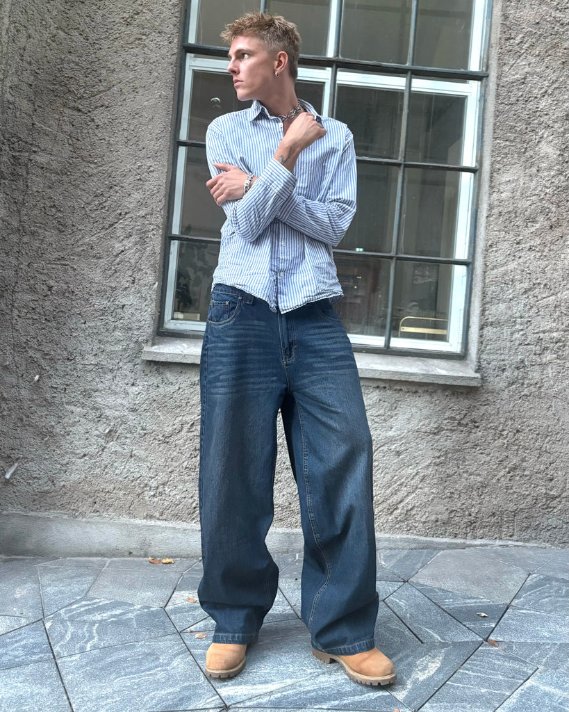 Baggy jeans til mænd er en af de hotteste trends lige nu og et must-have i enhver moderne garderobe. Inspireret af 90’ernes og 00’ernes streetwear, er baggy jeans tilbage i modebilledet med et råt, afslappet udtryk. Denne stil er især populær blandt modeikoner og influencers, der kombinerer baggy jeans til mænd med oversized jakker, chunky sneakers, og for tiden crop T-shirts og overdele. De brede bukseben giver et fedt, urban look, der kan tones ned med en simpel skjorte eller gøres mere med lag-på-lag styling. Store modebrands har genintroduceret baggy jeans til mænd på catwalken, og de ses nu i et væld af denimvaske og pasformer. Hvis du vil følge den nyeste streetwear-trend, er baggy jeans til mænd et oplagt valg. Gå all-in på en old-school vibe eller miks dem med moderne accessories for et opdateret og personligt udtryk.